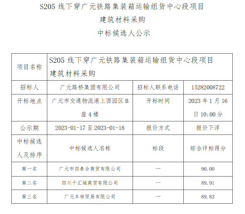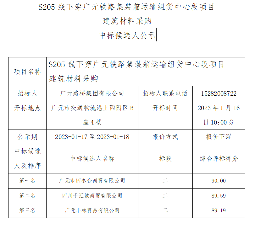 广元路桥集团有限公司S205线下穿广元铁路集装箱运输 组货中心段项目建筑材料采购中标候选人公示